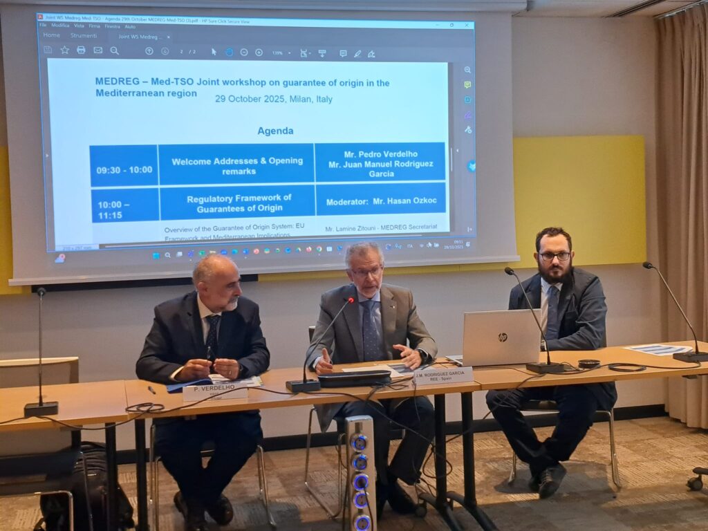 Together with MEDREG, we organised a joint workshop in Milan, Italy, focused on the role of GOs in enabling green electricity trading across the Mediterranean. The event brought together regulators, transmission system operators, and energy experts to exchange views on how these instruments can support the region’s energy transition.
