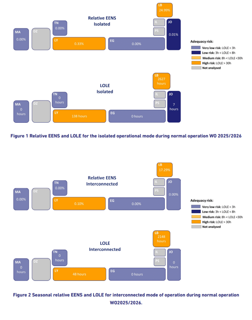 The Winter Outlook 2025–2026 shows very low adequacy risks for Morocco, Tunisia and Egypt, while Libya and Lebanon face significant structural shortages. Cross-border exchanges continue to play a vital role in reducing risk, with the commissioning of the Egypt–Saudi Arabia HVDC link expected to further strengthen system security.